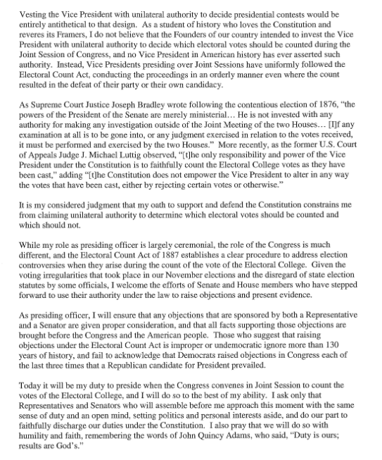 « J’estime que mon serment de soutenir et de défendre la Constitution m’empêche de revendiquer le pouvoir unilatéral de déterminer quels votes électoraux doivent être comptés et lesquels ne doivent pas l’être ».